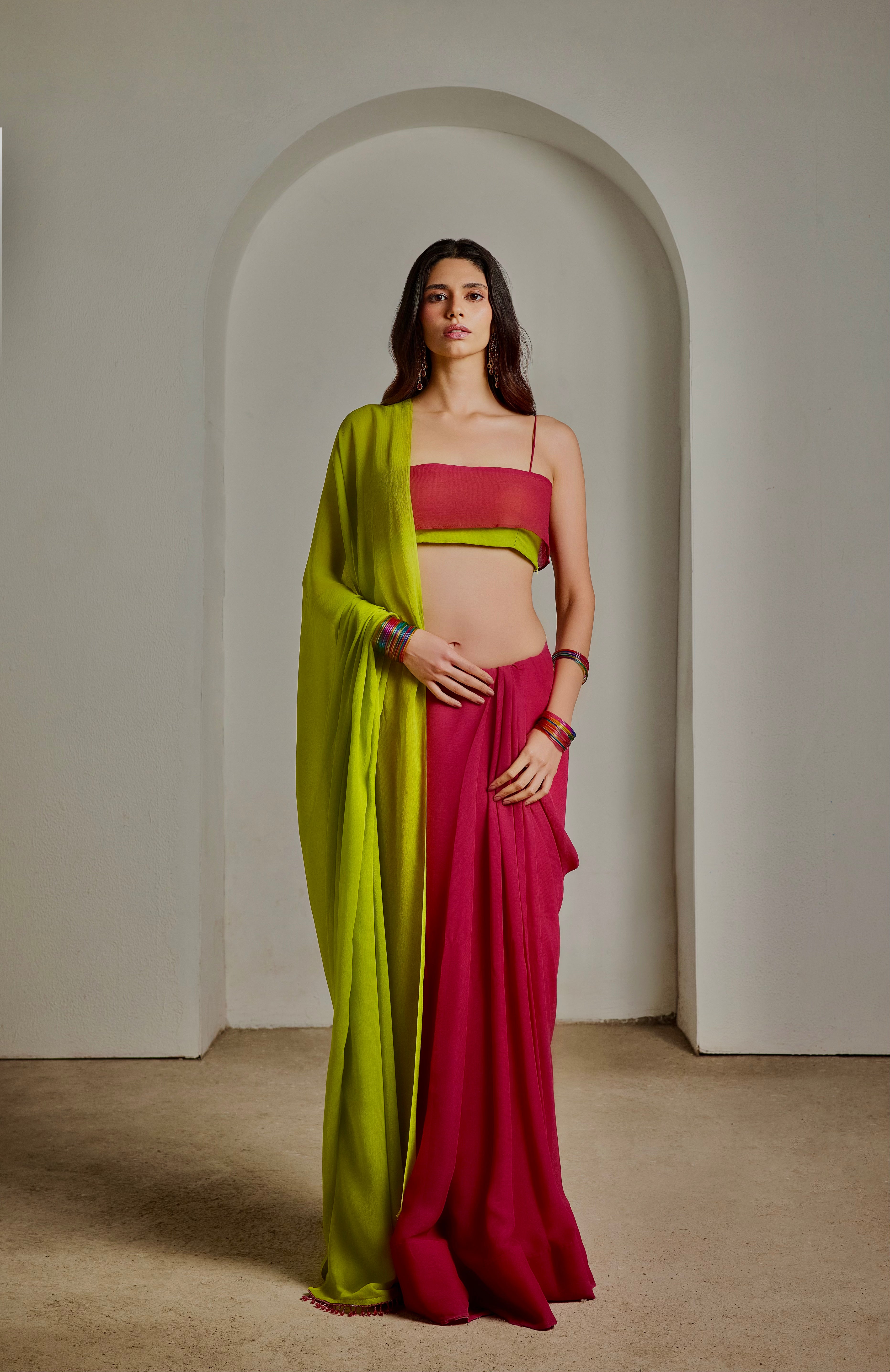 - Pre-Pleated Drape: Features pre-stitched pleats for convenience. Simply wrap, tuck, and drape the pallu — perfect for a quick and flawless look.